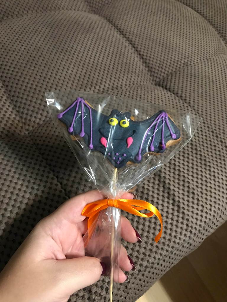 I did manage to go through the day and survive (YAY). I even took a gingerbread bat cake on a stick from the school treats for later and in the evening, comfy and on the sofa, after a good dinner and a brief no-nausea window, I did pull it out and ate it with joy.