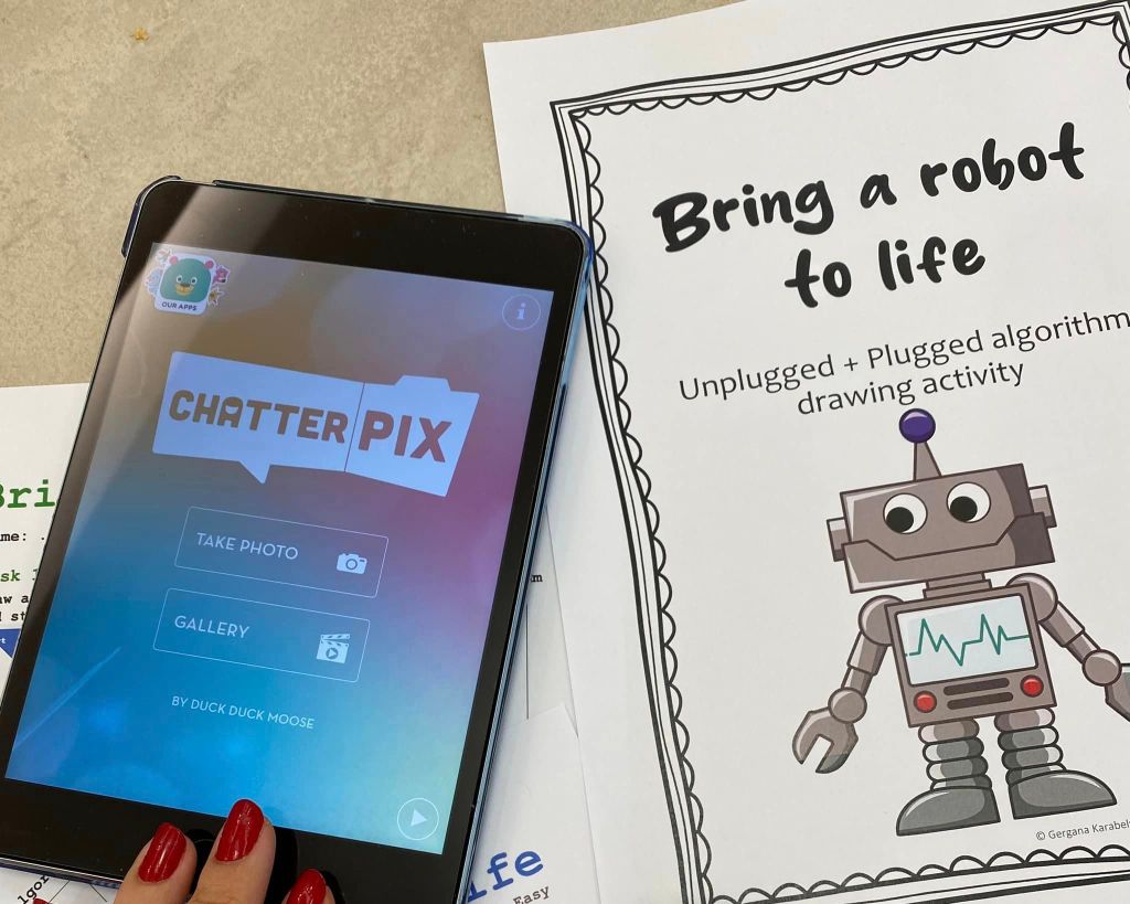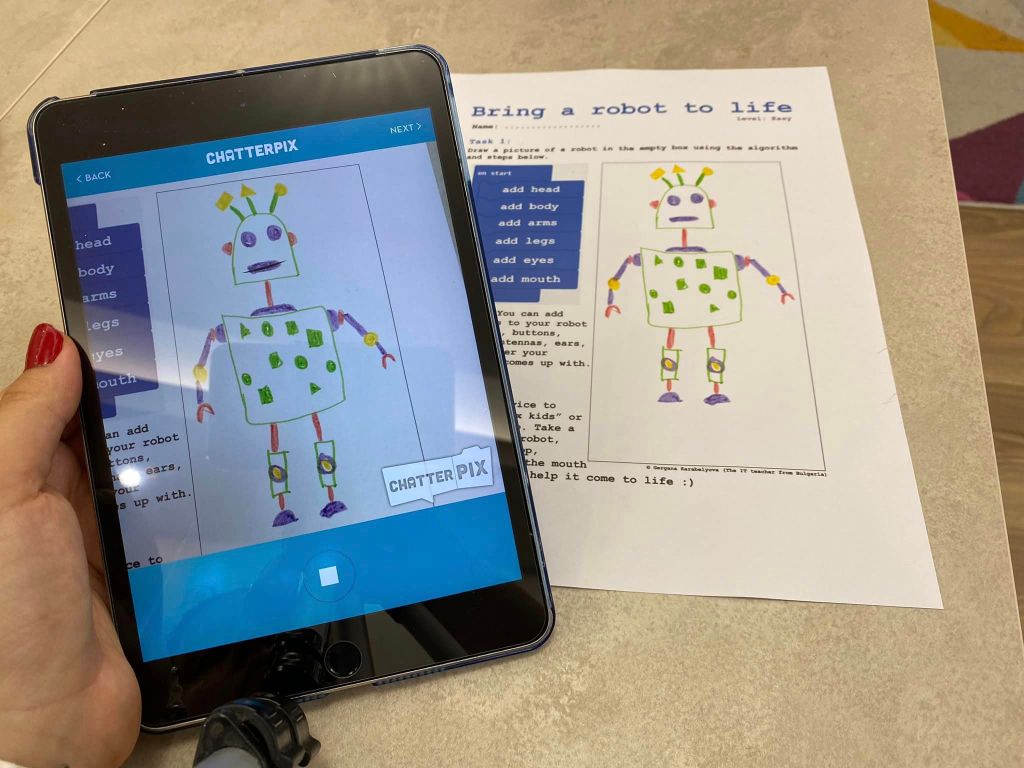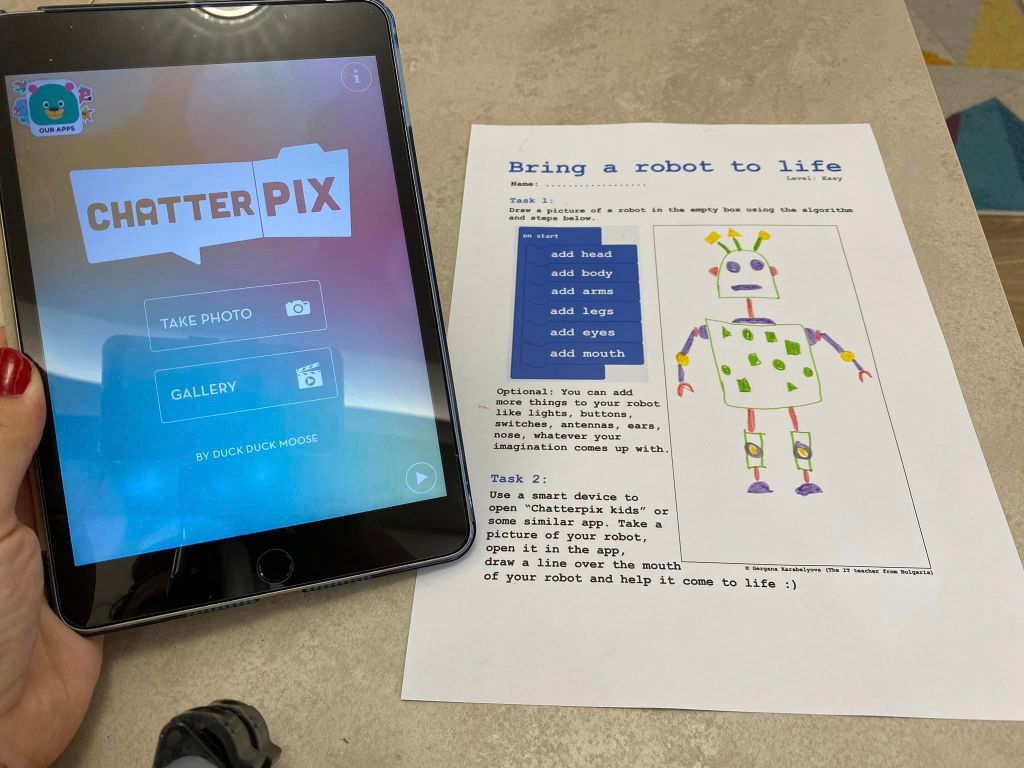 - When the lesson starts, the students receive a copy of the easiest task and they start working. If anyone wants something harder – I give them the choice to pick the intermediate or the hard level. Also, if anyone finishes too fast with a task, I give them the next level or a random one, so they can continue working. After the drawing part the student take their devices (they have personal tablets), they open “Chatterpix kids” (the normal “Chatterpix” app also work fine), they take a picture of their drawing and they animate it – they draw a line across the mouth of the robot, then they record some voice message and then they make the robot say it with the app.