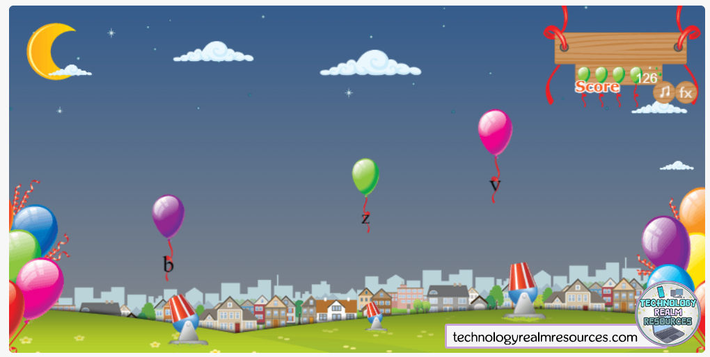 Some balloons start flying from the bottom, going up in the sky. Attached to each balloon is a letter that the students must find and press on the keyboard. That triggers one of the cannons on the ground to shoot, and if the letter is correct – they pop the balloon, otherwise they just shoot to the empty sky. It’s very fun! The bonus is – you can turn off the background music with a button on the upper right corner!