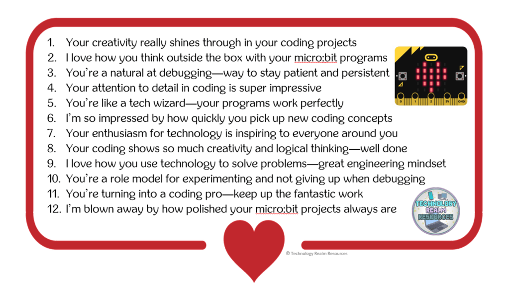 This project turns your micro:bit into a Random Compliment Generator, designed to brighten your day with personalized, techy compliments! The micro:bit uses its coding magic to generate a random number between 1 and 12 and then displays that number on its LED screen. Depending on the number, the student receives a special compliment for Valentine’s day from the cute little BBC micro:bit. The student simply needs to refer to the table below to find the compliment that matches their number. Here’s the table I designed for my lessons, feel free to use it in your lessons as well!