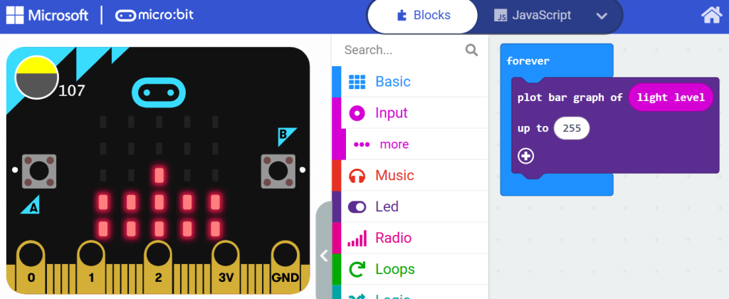 Data Collection activity: Use the light sensor functionality to record light levels over time and different places and analyze the data. You can always display the light level number (which will be between 0 and 255, 0 being absolutely no light, and 255 – the brightest possible situation) on the LED matrix instead of plotting it on a bar graph. Example – light under a student desk is 26, and light next to the window is 198.