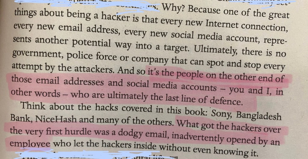 What struck me most was the underlying wisdom in the book. Many of these massive cyber heists happened because of simple phishing emails—employees clicking on suspicious links, opening shady attachments, or failing to verify sources.