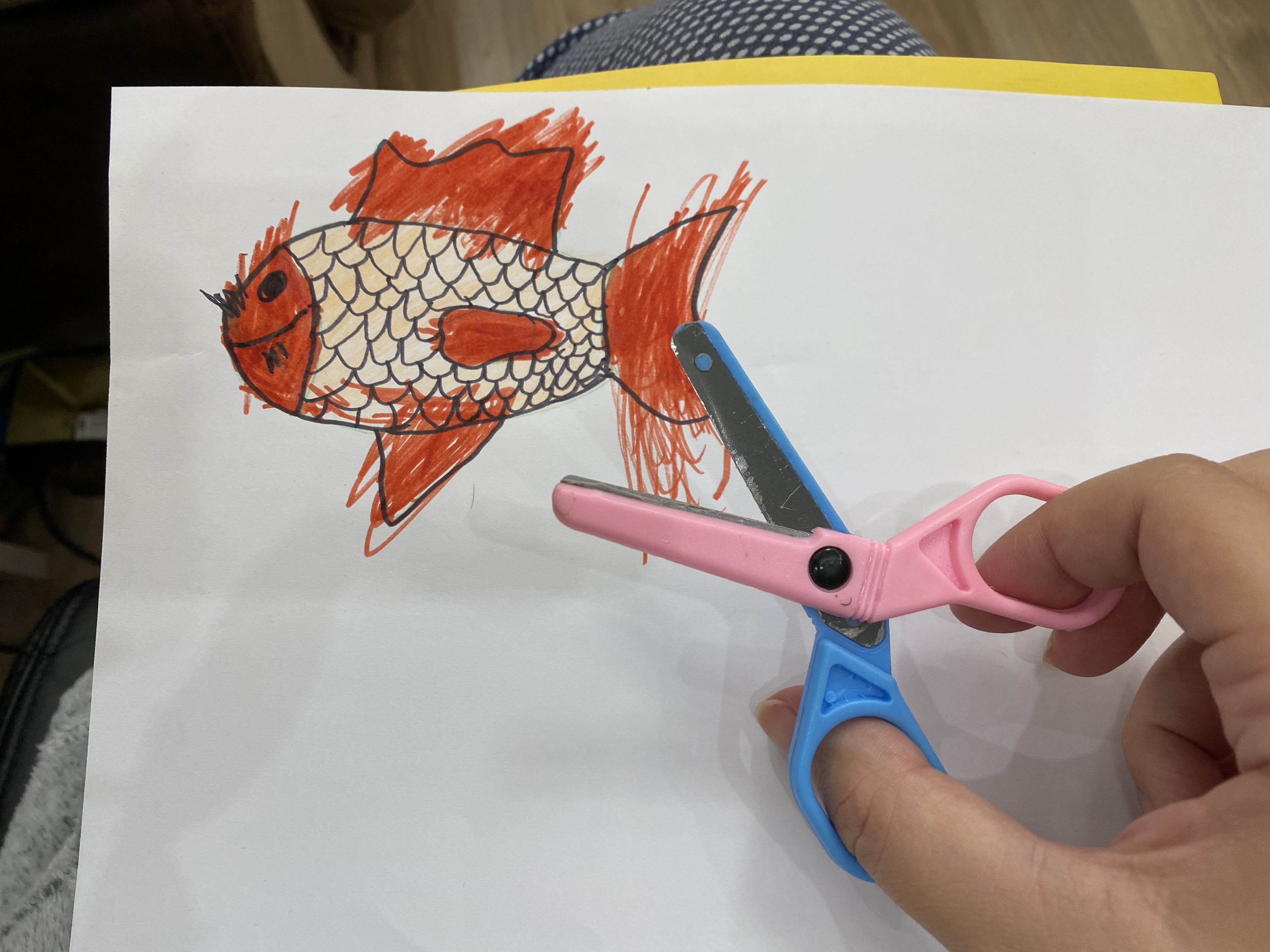 We grabbed some plain white A4 paper and drew three different fish. The kids started coloring them right away, making each one unique and vibrant.