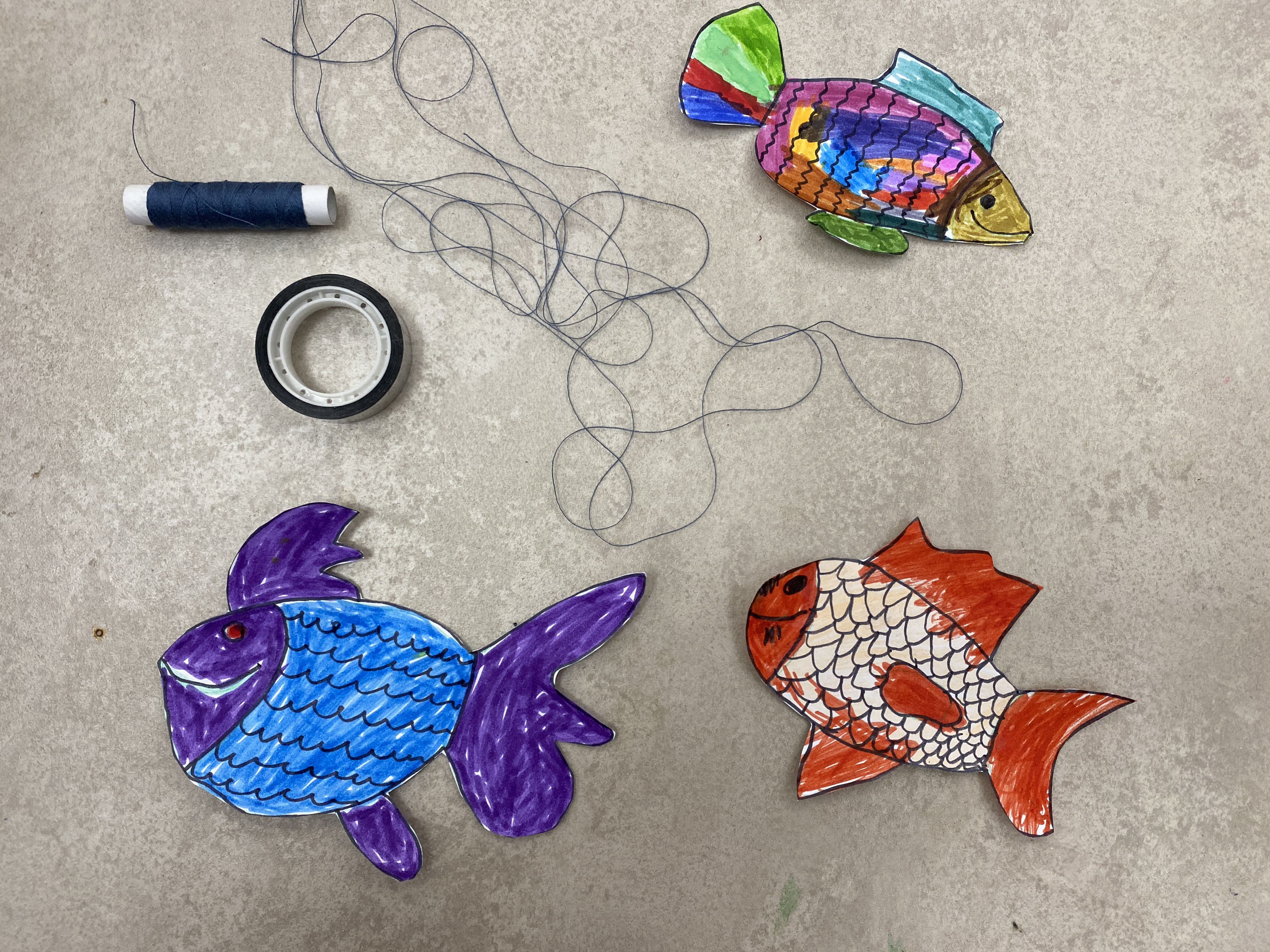 Once they were done, we cut them out and taped some simple thread to the back of each fish using colorful tape. The thread needed to be pretty long—about 60 to 70 cm—to allow for movement in the next step.