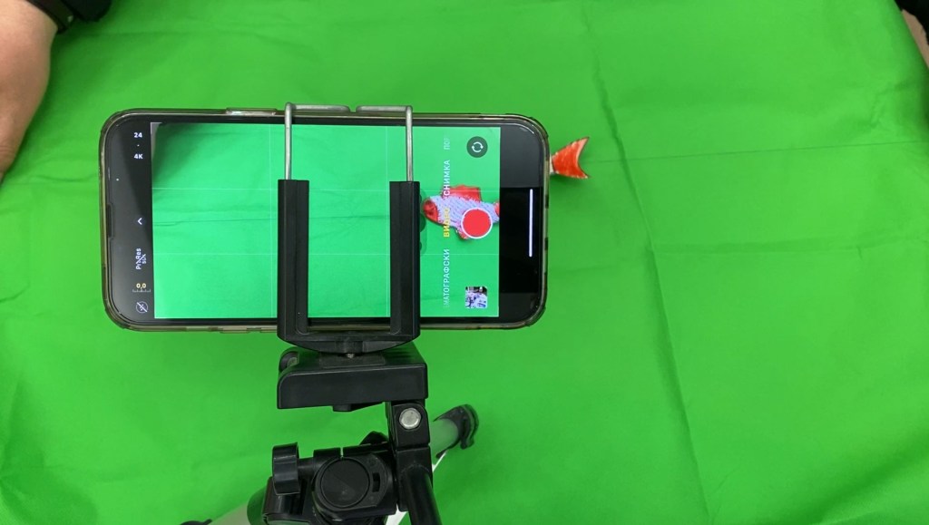 Next, we secured the smartphone to a tripod, though holding it by hand works too if you can keep steady. We placed a big green cloth on a flat surface to use as a background, but if you don’t have one, you can find special green screen fabric on sites like Aliexpress or Shein.