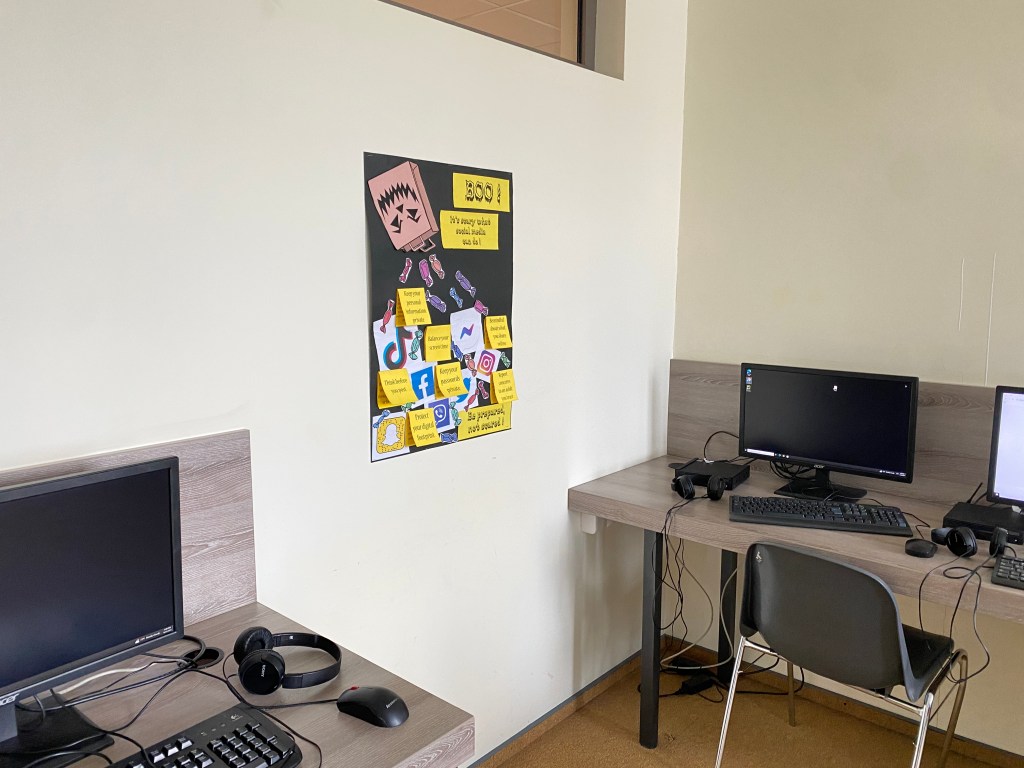 When students walk into the computer lab, they’re immediately greeted with a colorful, Halloween-themed poster that catches their eye. But this display isn’t just about spooky pumpkins and candy—it’s also packed with helpful tips for staying safe online, something I believe is extremely important! Messages like “Don’t share your real name online,” “Keep your personal info private,” “Protect your password,” and “Limit your screen time” encourage kids to think about the choices they make on their devices every single day. (a topic that’s been haunting me ever since I became a mother a couple of years ago)