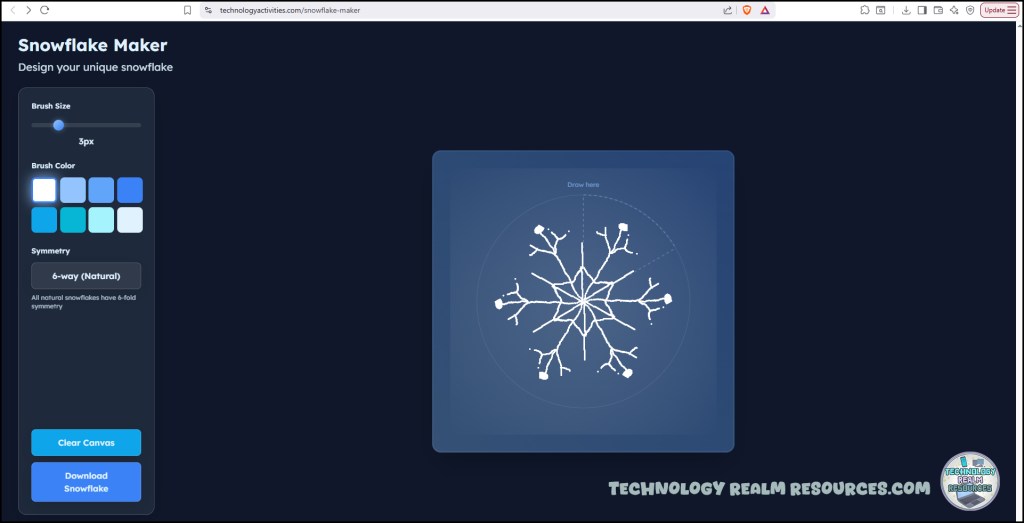 The interface runs directly in the browser, so there’s nothing to install and no accounts to create. Students can jump right in, experiment with symmetry, shapes, and patterns, and watch their unique snowflake come to life in real time. I think this exercise counts as STEM as well, ha-ha. Once they’re done, they can download their design instantly as an image by right-clicking the design and choosing “Save As Image” (the button “Download design” doesn’t currently work, I hope the website owners get to fix it soon).