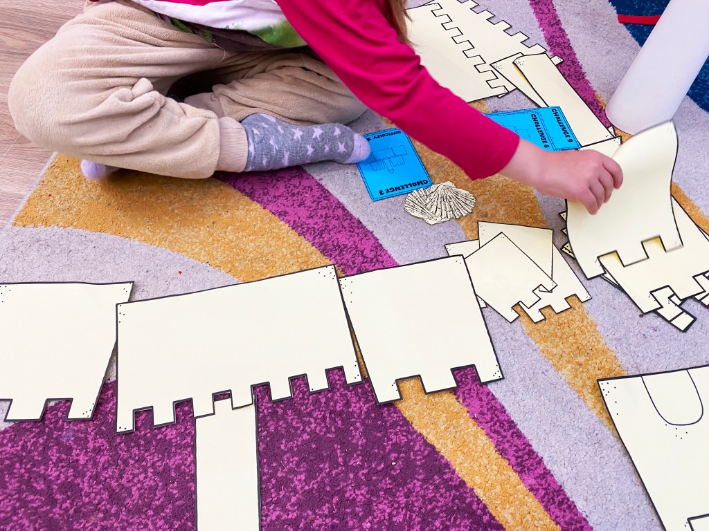 After reading, students jump straight into building their own sandcastles—but with a twist. They pick a challenge card (with different difficulty levels), study the design, and then recreate it using the “sand” blocks. Some follow visual models, while others get more creative with open-ended cards.